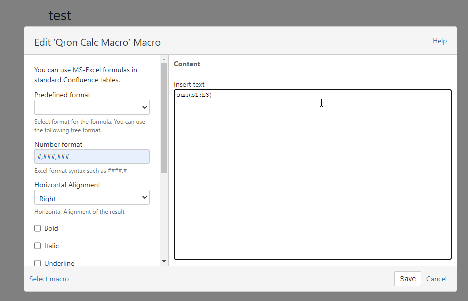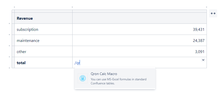 You only put 'Qron Calc Macro' on the Confluence standard table, then enter a formula in the macro body.